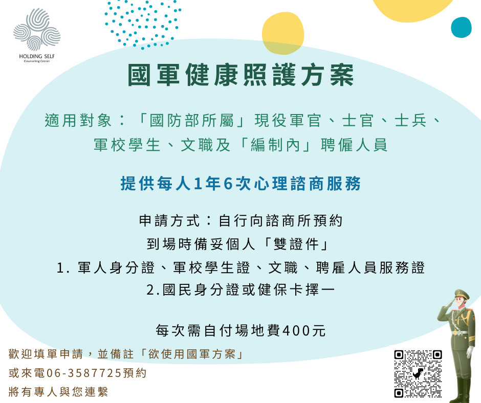 本方案適用對象為「國防部所屬」現役軍官、士官、士兵、軍校學生、文職及「編制內」聘僱人員,免費提供「每人1年6次心理諮商服務」。