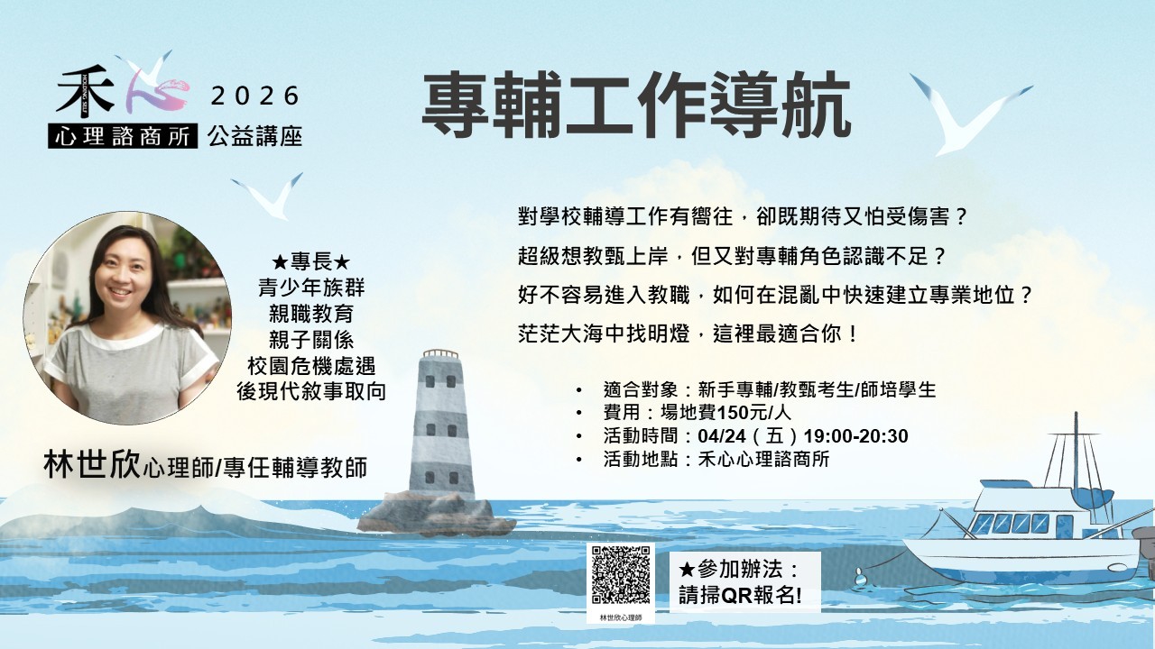 專輔工作導航(林世欣心理師) April 24, 2026 講座主題 對學校輔導工作有嚮往,卻既期待又怕受傷害? 超級想教甄上岸,但又對專輔角色認識不足? 好不容易進入教職,如何在混亂中快速建立專業地位? 茫茫大海中找明燈,這裡最適合你! 主講人: 林世欣 諮商心理師 禾心心理諮商所 諮商心理師 ⏰講座資訊⏰ 日期:115/04/24(五) 時間:19:00-20:30 方式:實體講座,地點:禾心心理諮商所 對象: 新手專輔/教甄考生/師培學生 費用:場地費150元/人 報名:線上報名 請先填寫此報名表,當您填寫完成即表示報名成功,謝謝您。 Share: 返回列表